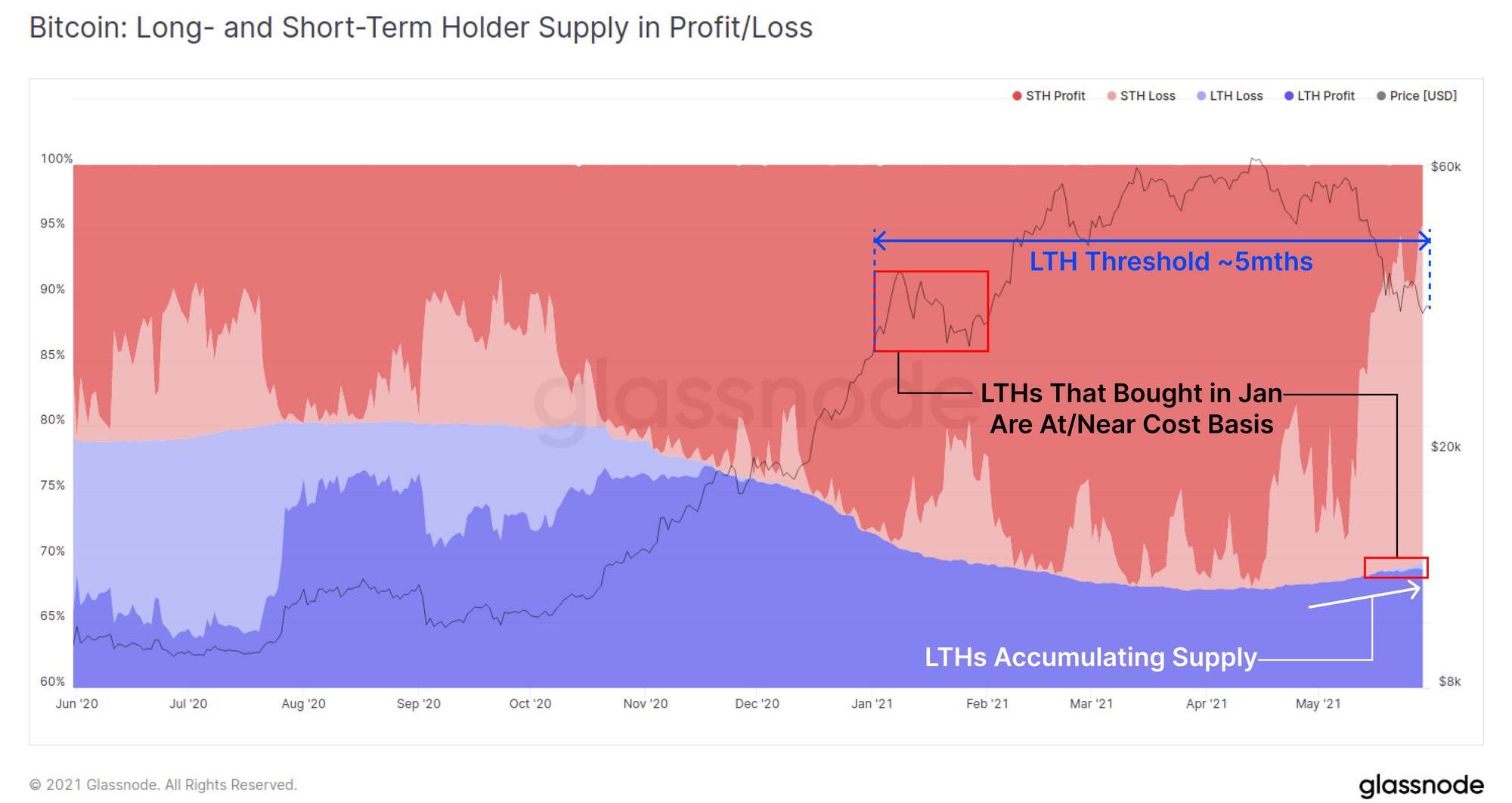 目前的市場結構非常有趣:五個月之前比特幣的價格僅略低于當前水平。因此,2021年之前積累的盈利幣基本都由長期持幣者持有,于12月底或1月初入場的人也已接近其成本價。相反,短期持幣者則幾乎都處于未實現虧損的狀態。
