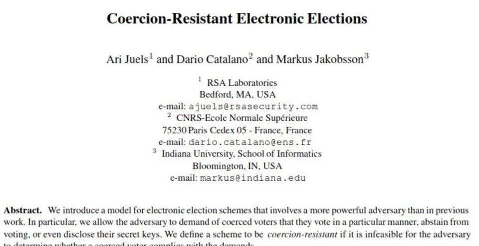 以加密方式安全執行社交機制的概念并不是區塊鏈的極客們發明的,實際上早在之前就存在了。在區塊鏈領域之外,密碼學家有一個20年的傳統,致力于安全的電子投票問題,好消息是已經有了解決方案。Juels,Catalano和Jakobsson在2002年發表的題為“抗脅迫的電子選舉”的論文在過去20年里被很多文獻引用: