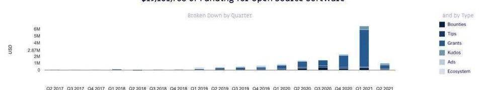 由于加密貨幣行業整體的增長,Gitcoin獲得了巨大的推動力。比特幣、以太坊和數百個開源加密項目最終在其協議中內置了資金。這在互聯網歷史上首次為開源生態系統帶來了數十億美元的資金。Gitcoin認為這有巨大的影響,許多尚未探索。