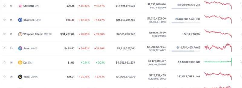 其余主流幣以及各DeFi代幣普遍跌幅在50%左右,比去年312單日跌幅更甚;如下所示: