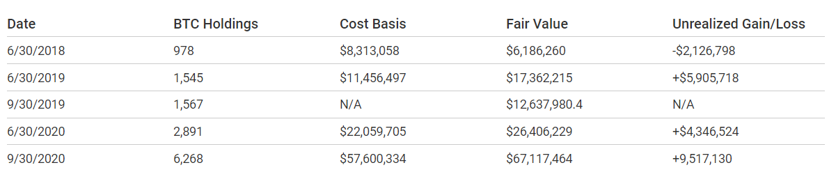 MicroStrategy是一家開發商業智能軟件的科技公司。該公司將比特幣作為主要儲備資產,今年8月,MicroStrategy宣布以2.5億美元買入比特幣,隨后又買入了1.75億美元的比特幣。