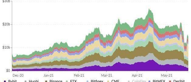 比特幣期貨的統計范圍包括BitMEX、幣安、Bitfinex、Bakkt、Bybit、CME、Deribit、FTX、火幣和OKEx。以太坊期貨的統計范圍包括BitMEX、幣安、Bitfinex、Bybit、CME、Deribit、FTX、火幣和OKEx。