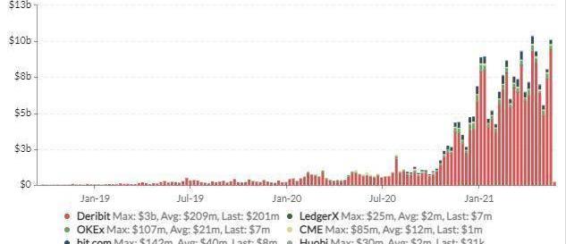 比特幣期權統計范圍包括幣安、Bakkt、Bit.com、CME、Deribit、火幣、LedgerX和OKEx。以太坊期權統計范圍為Bit.com、Deribit、火幣和OKEx。