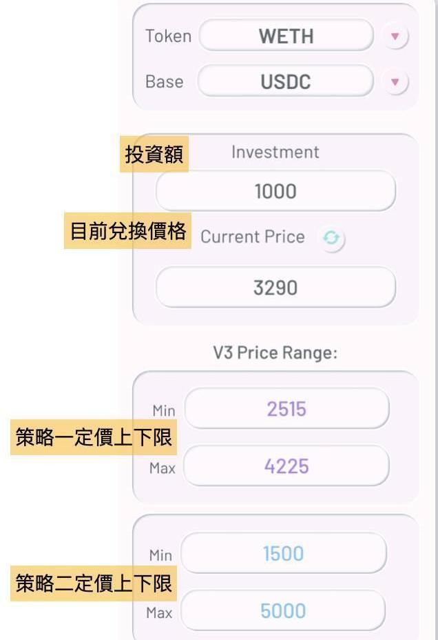 案例中的策略一價格范圍較窄,策略二價格范圍更寬一點。策略一設定的上下限是2515~4225,表示僅在這個范圍提供流動性,若超過WETH/USDC超過4225,那么你的流動性會全數變成USDC,若低于2515,就會全數轉為WETH。策略二同樣適用上述邏輯。