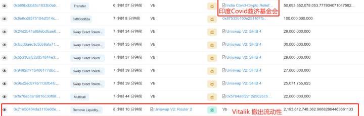 鏈上數據顯示,此前持有總量50%SHIB的V神在凌晨一共進行了8次SHIB代幣轉移,其中最后一筆為數額最大的轉賬,價值約10億美元。該筆轉賬的收款人為印度Covid救濟基金會。截至發稿,印度Covid救濟基金會并未拋售SHIB。