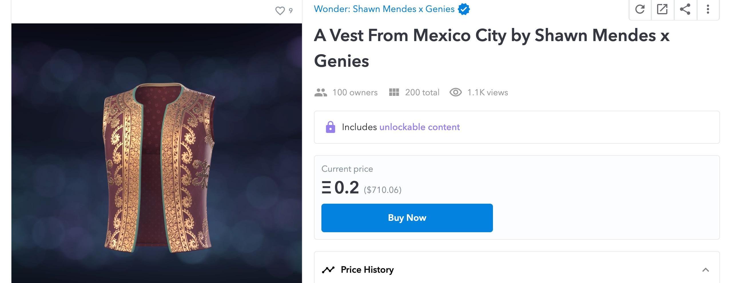 緊接著,Genies還為歌手肖恩·門德斯(ShawnMendes)設計專屬數字產品,并在Opensea上出售。