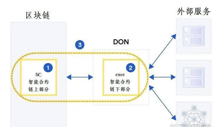 混合智能合約通過將鏈上和鏈下計算資源安全地組合到一起來增強智能合約的功能。混合智能合約是由兩個互補組件組成:駐留在區塊鏈上的鏈上組件SC和在DON上執行的鏈下組件exec。DON是這兩個組件之間的橋梁,也是連接混合合約與非鏈資源的橋梁。