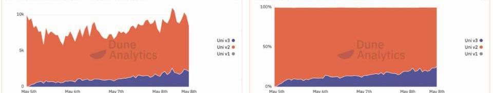 正如我們所看到的,UniswapV3在5月5日正式上線,上線當日交易額便出現激增,隨后開始穩步增長,份額越來越大。在5月5日那天結束時,UniswapV3的交易額占到Uniswap總交易額的10%。不過在本文撰寫時,這一比例數字已經上升到了25%。