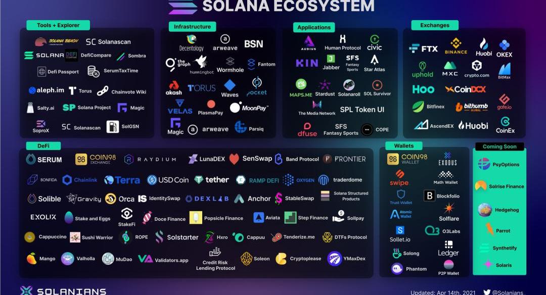 Solana公鏈最早于2017年開始研發,致力于提高公鏈延展性,同時保證去中心化和安全性。自2020年DeFi崛起后,FTX選擇Solana作為支撐其去中心化金融生態搭建的底層公鏈,而其它成熟的項目也不斷集成Solana,如公鏈Terra、預言機Chainlink、大宗經濟協議OxygenProtocol、數據檢索工具TheGraph等。
