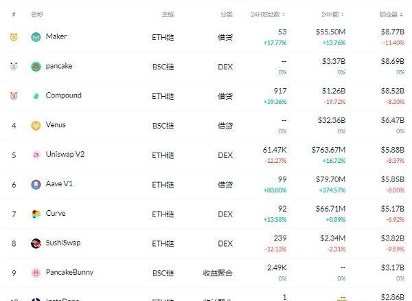 DeFi項目鎖定資產前十排名及鎖倉量,數據來源:Debank
