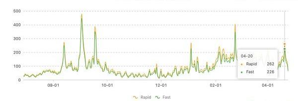根據Gasnow網站數據顯示,4月25日,“快速”交易的gas價格為42Gwei。4月20日,在“快速”模式下,Gas平均gas價格為226Gwei。在過去5天,Gas價格下降了81%。這是2021年以來的最低位。