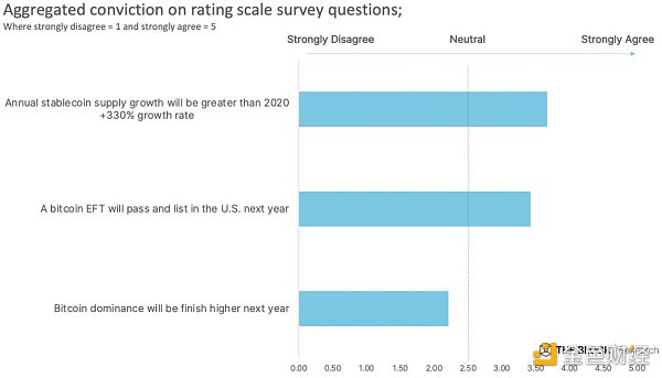 展現出最強信心的問題:在眾多問題中,受訪者對穩定幣供應增長最有信心,他們相信增長速度同比增長330%,2021年美國將會通過一只BTC ETF。