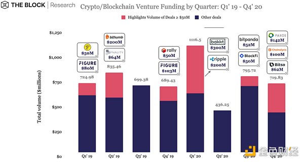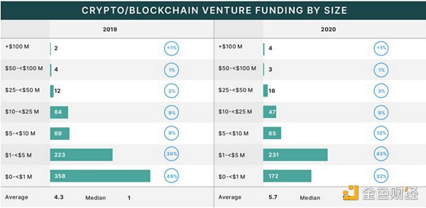 總體而言,大約有31億美元用于投資加密貨幣區塊鏈項目,平均交易規模約570萬美元,交易規模中值為180萬美元。風險投資交易量也保持相當穩定,與美元交易量相同,2020年有774筆風投交易,而2019年為732筆,同比增長約6%。