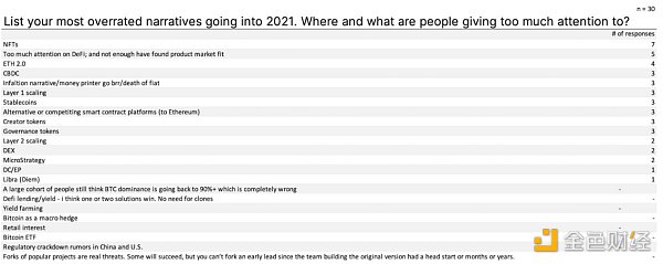 DeFi及對以太坊升級的展望仍會是業內最值得探討的話題:根據Block Research 2021年投資者調查,在“2021年前最受低估事件”列表中,DeFi位列第二,ETH 2.0 layer2擴展應用排名第一,這與The Block展望2020年調查結果一致。受訪者認為2021年NFT會是更加熱門的話題。諷刺的是,NFT、DeFi及ETH 2.0分別在2021年前關注度過高的事件中排名前三。這顯示了投資者對與以太坊生態系統的看法還是有很大分歧。