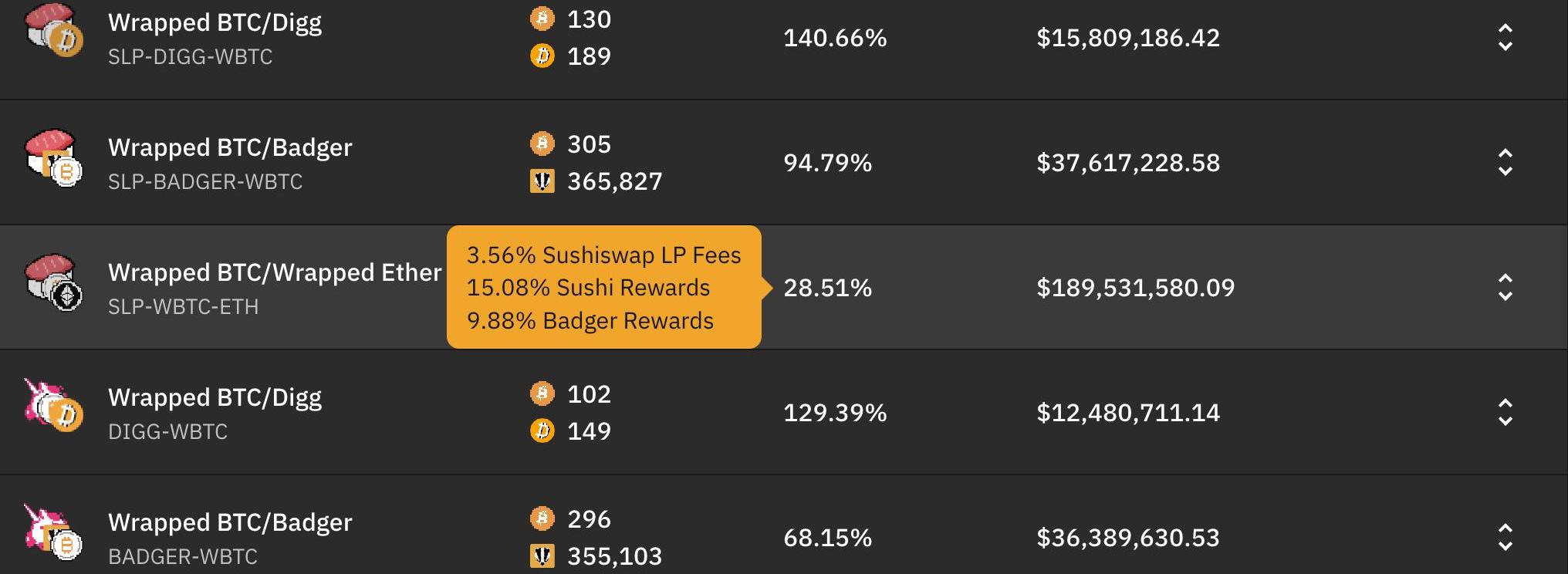 雖然基于Curve的sett資金庫為WBTC的交換提供了流動性,但除了一個Uniswap和Sushiswap的等價庫外,其他都是在為Badger原生代幣—BADGER和DIGG提供流動性。