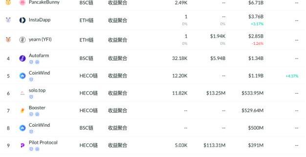 DeFiBox數據顯示,已經有29個聚合收益應用出現在各個鏈上。TVL排名第一的是建立在BSC上的PancakeBunny,總鎖倉價值為67.1億美元,排在其后的分別是InstaDapp和yearn,TVL分別為37.6億美元和28.5億美元。