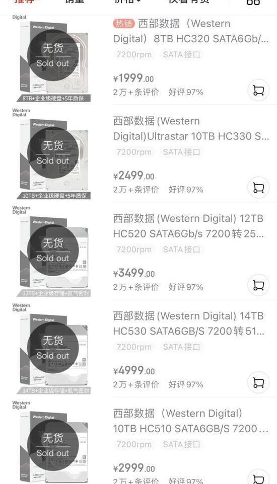 ▲某品牌大容量硬盤處于無貨狀態來源:電商平臺