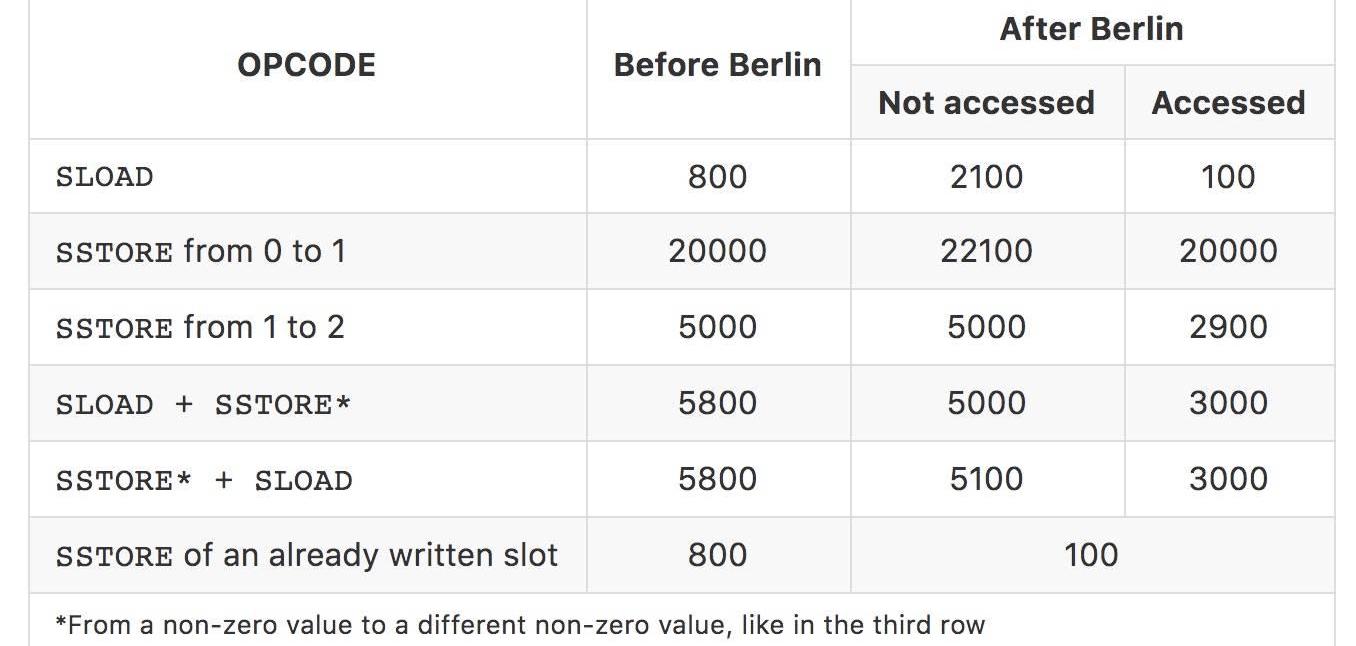 在柏林硬分叉之前,SLOAD的固定成本是800gas,現在,這取決于是否已訪問了存儲slot。如果未訪問,則成本為2100gas,如果已訪問,則成本為100gas。因此,如果slot在已訪問的存儲密鑰列表中,則一次SLOAD的成本會降低2000gas。