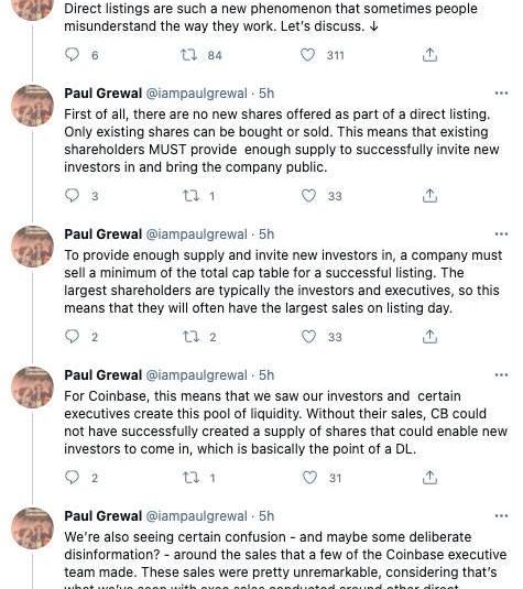 Coinbase總法律顧問PaulGrewel在推特指出了這一點。他評論道,“為了提供足夠的供應并吸引新的投資者,一家公司必須賣出總股權結構表中的最低數量,才能成功上市。最大的股東通常是投資者和高管,因此這意味著他們在上市當日的銷售額往往最大。”