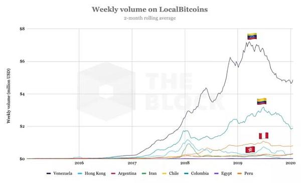 Block的Larry Cermak在推特上發布了有關委內瑞拉的localbitcoins.com點對點市場交易量增長的推文。委內瑞拉比其他“高風險”經濟體(例如阿根廷,哥倫比亞,土耳其和伊朗)購買的比特幣要多得多,阿根廷,哥倫比亞,土耳其和伊朗等國也認為,比特幣交易量的增加是對沖通貨膨脹率的對沖工具之一。