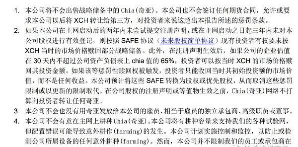 Chia商業白皮書中披露“自成立以來,公司已經通過SAFE協議籌集了約1600萬美元資金。這些資金主要分三輪,有三種不同標準的價格上限,和轉換功能。最后一輪500萬美元的融資已于2020年8月完成。沒有向任何投資者被承諾以chia作為投資回報。某些投資者擁有贖回權,如果公司在上述特定時間段內未將股權上市公開交易,則將以Chia(奇亞)幣的當時價格計價。本公司預計將這些SAFEs轉換為股權或優先股權,并且不打算在本公司股權注冊聲明生效前向投資者提供XCH。”