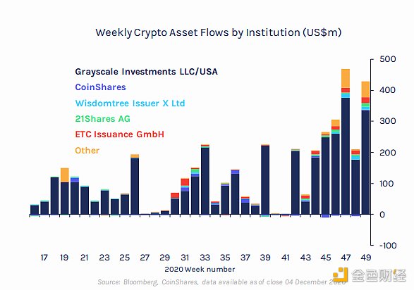 XRP/HKD-4.48%據Coinshare12月7日發布的覆蓋ETPs, 相互基金和OTC的加密資產流動周報,上周加密資產領域錄得2020年度第二大投資流入,共計4.29億美元。