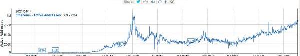 根據bitinfocharts.com最新數據,如圖所示,目前比特幣鏈上活躍地址數觸及97萬,達到2017年12月份的歷史高位,以太坊鏈上活躍地址數觸及87萬,接近2017年12月份的歷史高位100萬。