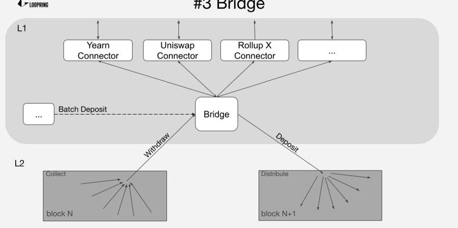 這個橋允許用戶使用批存款將資金有效地存入Loopring,相比每個用戶單獨加入zkRollup網絡,通過標準的L1智能合約直接在L1上提供批存款功能,以允許用戶一起加入L2網絡,通過這種設計,就可以將多筆交易聚集成一筆L1交易,從而有效降低手續費。這使得中心化交易所也可以使用標準的L1基礎設施輕松地支持Loopring的L2網絡。