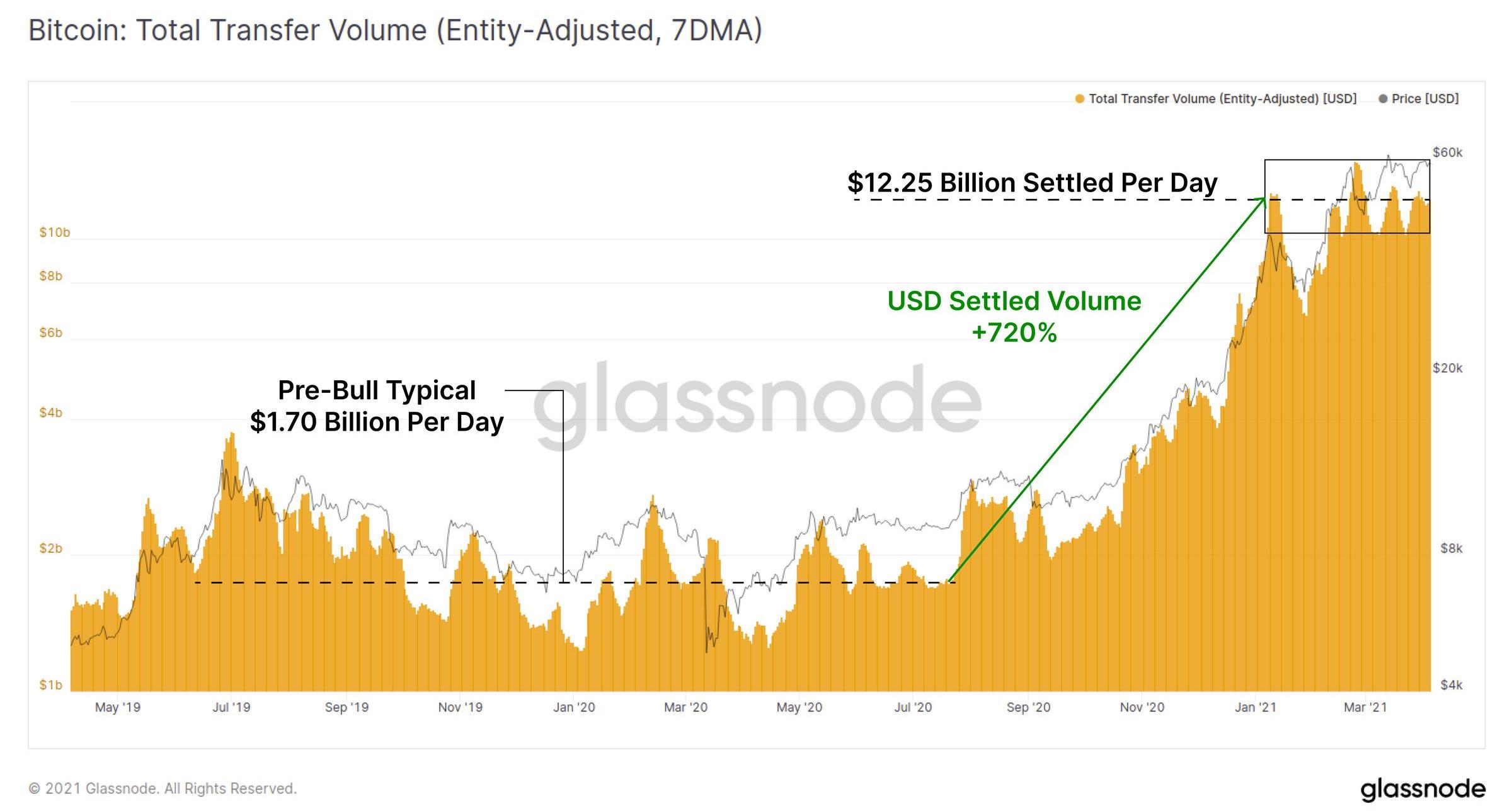 從2019年到2020年中,比特幣網絡通常每天的EA交易量約為17億美元,此后,鏈上交易量與價格一起上漲了720%以上,目前比特幣網絡每天的鏈上交易量約為122.5億美元。這意味著,除了幣價大幅上漲的因素之外,交易量也同樣出現了增長,這支持并證明了牛市的表現。