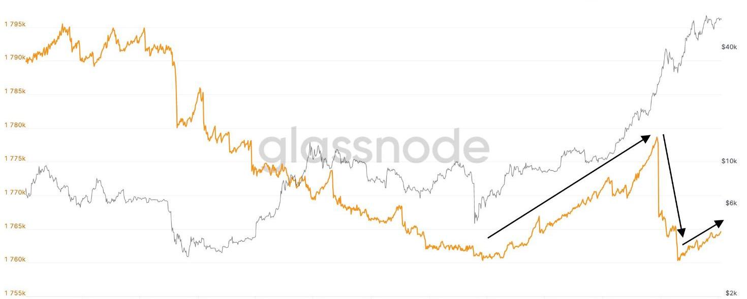 據Glassnode數據顯示,未花費的比特幣供應量——從未從(礦工)原始接收地址轉移過的比特幣——在經歷了1月份的大幅下降后開始上升,當時首次從挖礦地址轉移了1.5萬枚之前休眠的比特幣。