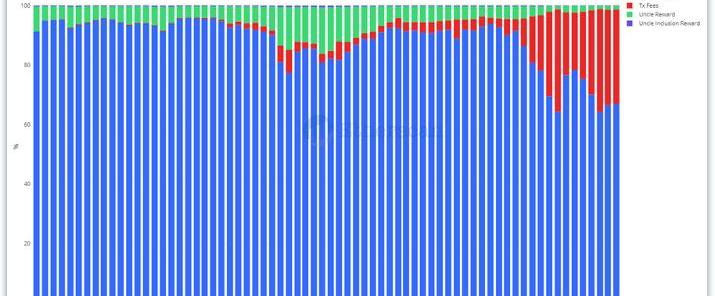 上圖:2015年以來,交易費(紅色部分)占以太坊礦工每月總收入的百分比變化情況。