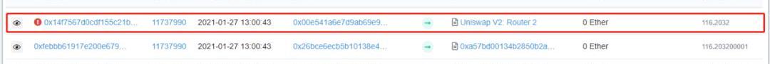 上圖:以太坊區塊11737990?中包含的一筆被搶跑的失敗交易,這筆失敗的交易的Gas價格僅比另外兩筆成功搶跑的交易低了0.000000001Gwei。(點擊圖片放大)