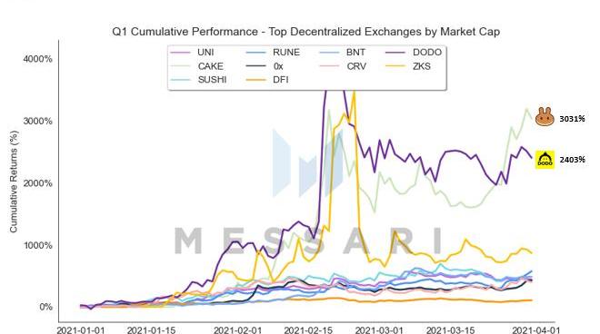 去中心化交易所是市場表現最好的領域之一。除了PancakeSwap的天價回報外,相對于該領域的其他玩家,DODO的回報率也高達2403%。2月中旬,運行在Ethereum和幣安智能鏈上的主動做市商DODO宣布推出V2公測版。交易者對這一消息作出了積極的反應,導致自本季度初以來的回報率達到了4000%。然而,由于黑客攻擊——黑客從交易所抽走了價值380萬美元的代幣,導致價格沖高維持的時間很短。