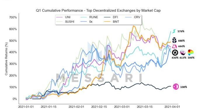 除了鶴立雞群的CAKE和DODO,THORChain和Bancor也領銜去中心化交易所賽道的上漲。2月中旬,RUNE在MulticoinCapital透露?他們在這上面有大的倉位后的24小時內上漲了30%。這一消息在整個加密市場引起共鳴,引發代幣需求上漲,使RUNE在21年第一季度的總回報率達到579%。