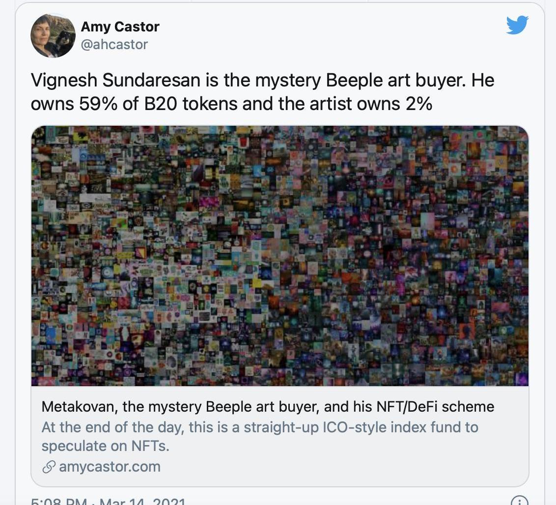 當Beeple的藝術品以6,930萬美元的價格賣給了一條鯨魚時,這條鯨魚的化名是“Metakovan”,加密貨幣記者AmyCastor后來透露了他的身份,即加密企業家VigneshSundaresan。