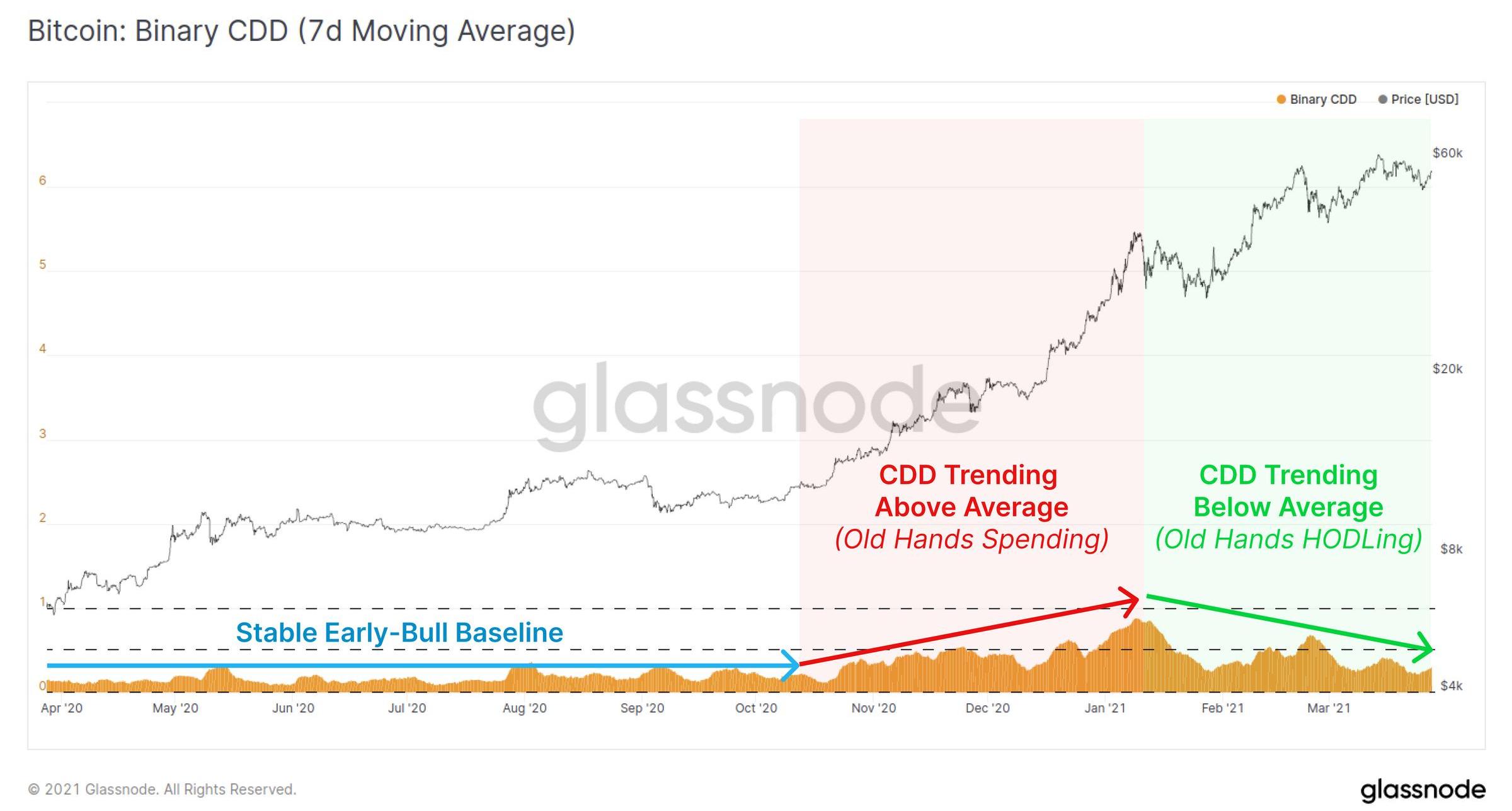 提示:將移動平均線應用于二元CDD有助于發現趨勢并從指標中濾除噪聲。有關詳細信息,請查看Glassnode學院中關于該改進指標的說明。