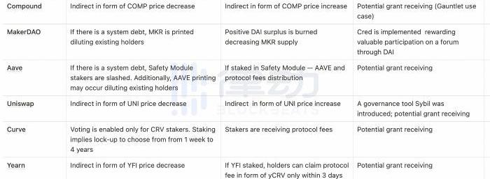 如果協議治理不當,治理參與者應該承擔后果的財務風險。最好的例子有長期鎖定(Curve)、罰沒/支付保險基金(Aave)、稀釋(MakerDAO、Aave)。注意:害怕失去不應該是唯一的動機因素;