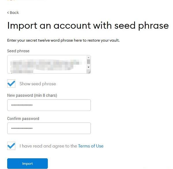 MetaMask是ETH以及NFT交易常用的一個錢包服務,巧的是,前幾年加密貓CryptoKitties火的那段時間硅星人也玩過,當時它建議使用的錢包就是MetaMask。于是我去把老電腦里備份的助記詞(seedphrase)找出來,填寫進去,就恢復當時創建的賬戶了: