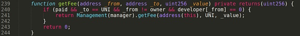 由于Management.getFee()函數背后的邏輯無法得知,因此項目擁有者有可能通過操作Management.getFee()函數返回值的方式,調整每次代幣轉移的費用,進行惡意操作等。
