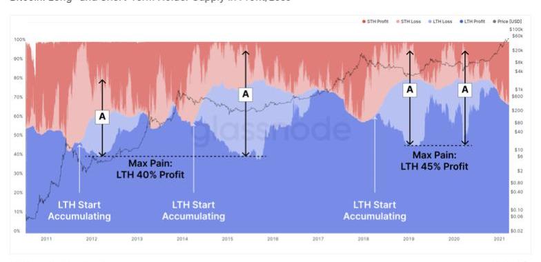階段A-最痛苦的階段:這個時期處于熊市最慘的階段,BTC持有者的最大橫截面處于虧損狀態。從逐漸增加的淺藍色區域可以看出,短期持幣者在熊市一半左右的階段開始累積比特幣。