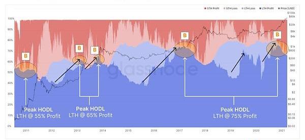 B階段--牛市階段:隨著牛市的發展,較高的價格為持有者者創造了較大的賣出誘惑。在某個階段,我們遇到一個拐點,LTH擁有幣的最大比例是盈利的。一般來說,這對應的是突破上一個周期ATH。