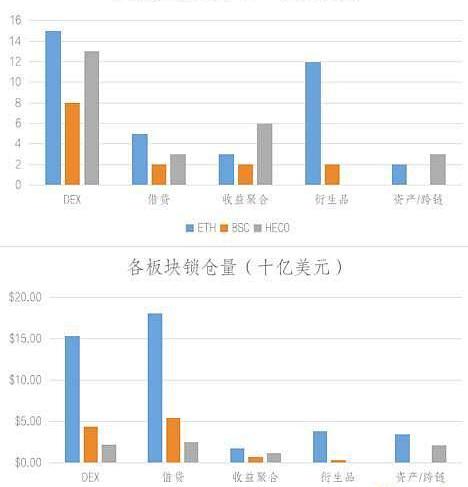 有趣的是,BSC鏈上的DEX、借貸和收益聚合項目的項目數和鎖倉量的分布與以太坊DeFi生態有類似特征,只不過規模相對縮小;而Heco鏈上的項目以DEX和收益聚合居多,單項目鎖倉量少。BSC和Heco上的衍生品板塊發展均比較有限。