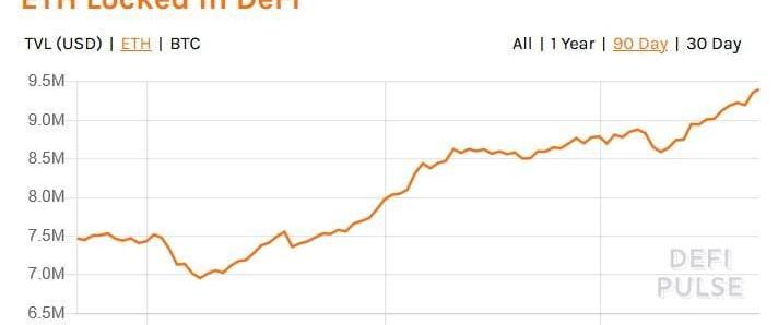 DeFiPulse數據顯示,DeFi協議中鎖定了接近940萬個以太坊。這一數據在2月底出現了下滑,但自3月8日以來,DeFi協議又吸收了近150萬個ETH。