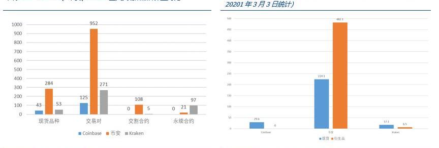 可見,Coinbase僅提供有限品種的現貨交易對,目前還不能提供衍生品服務,這一點使得其與幣安、Kraken等交易所逐漸拉開了差距。現貨交易品種數量上與后兩家有不小的差距外,交易量跟幣安比更是差了進一個數量級。根據coingecko數據,2021年3月3日24時,Coinbase、幣安和K網三家交易所現貨24小時交易量分別為29.6億美元、224億美元和17億美元。