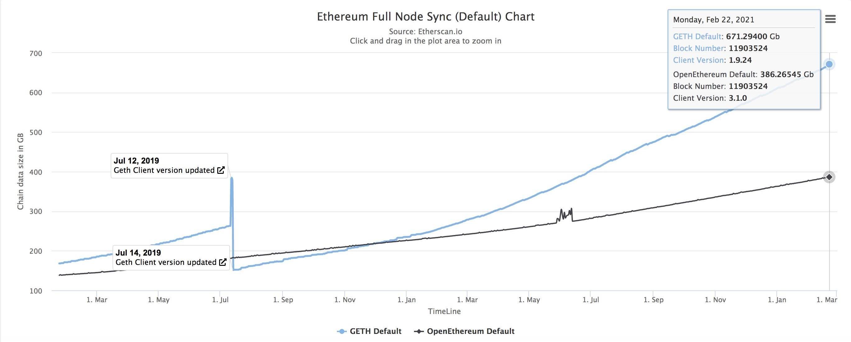 根據etherscan.io統計的數據顯示,當前最流行的以太坊全節點GETH的存儲數據大小已達到了671.29GB,而在去年同期,一個GETH全節點還僅有270.59GB,如果沒有技術改進,1年后一個以太坊全節點的存儲數據就能輕松超過1TB,而存儲全部數據的歸檔節點則可能會超過10TB的數據規模。