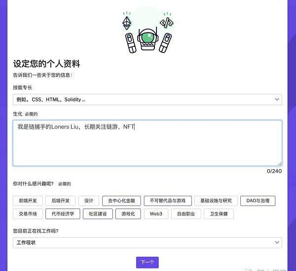 第三步,使用Github完成登入后,Gitcoin要求用戶設定自己的初始資料,這里需要注意的是,在最下方會問你工作的狀況,如果你只是來參加捐贈活動,則不需要填寫這一欄,否則需要補充對應的信息,當然如果你除了想參加捐贈,今后還想參加Gitcoin舉辦的其他活動諸如黑客馬拉松可以根據你的需求來填寫。