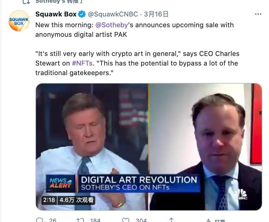 3月16日,據CNBC報道,知名拍賣平臺蘇富比CEOCharlesStewart宣布,將在下個月拍賣知名藝術家PAK的NFT作品。Charles表示蘇富比一直在關注NFT領域的發展,關于PAK的NFT作品拍賣將分別拍賣版和開放版,拍賣版為單間拍賣,開放版為限時不限量搶購。