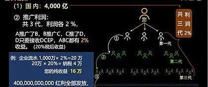 在這個11頁推廣材料中,詳細講述了分潤體系。其以國家政策性獎勵為名號,宣稱此次有1.2萬億推廣獎勵資金,包括國內4000億,國外8000億,限時推廣18個月,發完項目即結束。