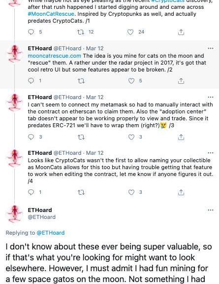 幾乎沒有人聽說過MoonCats,直到3月12日,推特用戶@ETHoard發推稱,“我開始四處挖掘,然后發現了MoonCatRescue。它同樣受到CryptoPunks的啟發,實際上比加密貓還要早。”