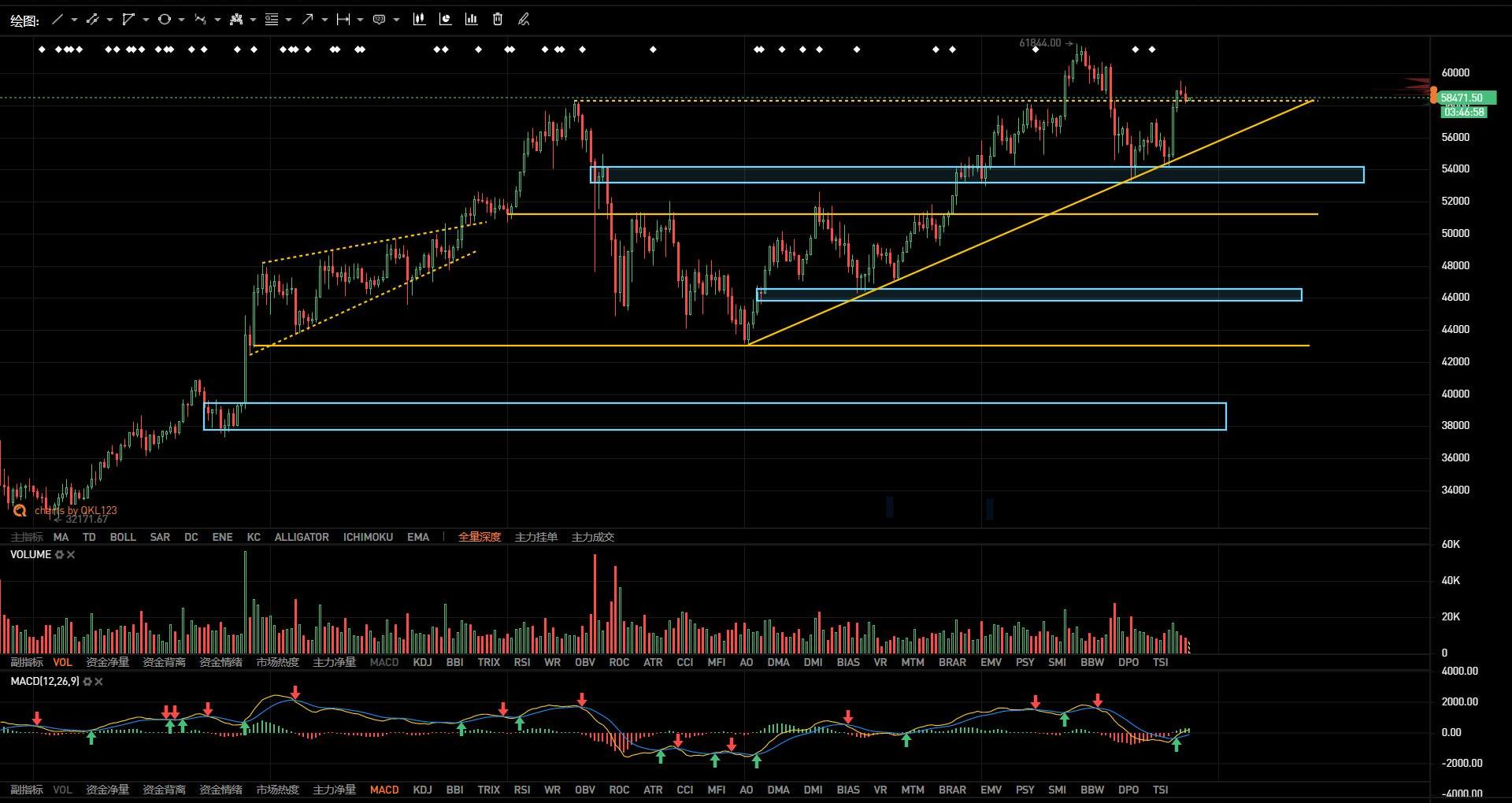 繼上期報告所述,后續關注上升趨勢線維持情況,若跌破有可能產生進一步下跌,反之看向前高58352。如圖所示,自上期報告至今,凌晨時刻美聯儲宣布將聯邦基金利率目標區間維持在0-0.25%不變,符合市場預期,對比特幣市場也造成巨大影響,比特幣于上升趨勢線得到支撐,隨后再次上漲沖破前高,當前于前高附近震蕩。后續仍關注圖中上升趨勢線維持情況,若跌破可能此次短期上漲趨勢宣告結束,反之有望突破新高。